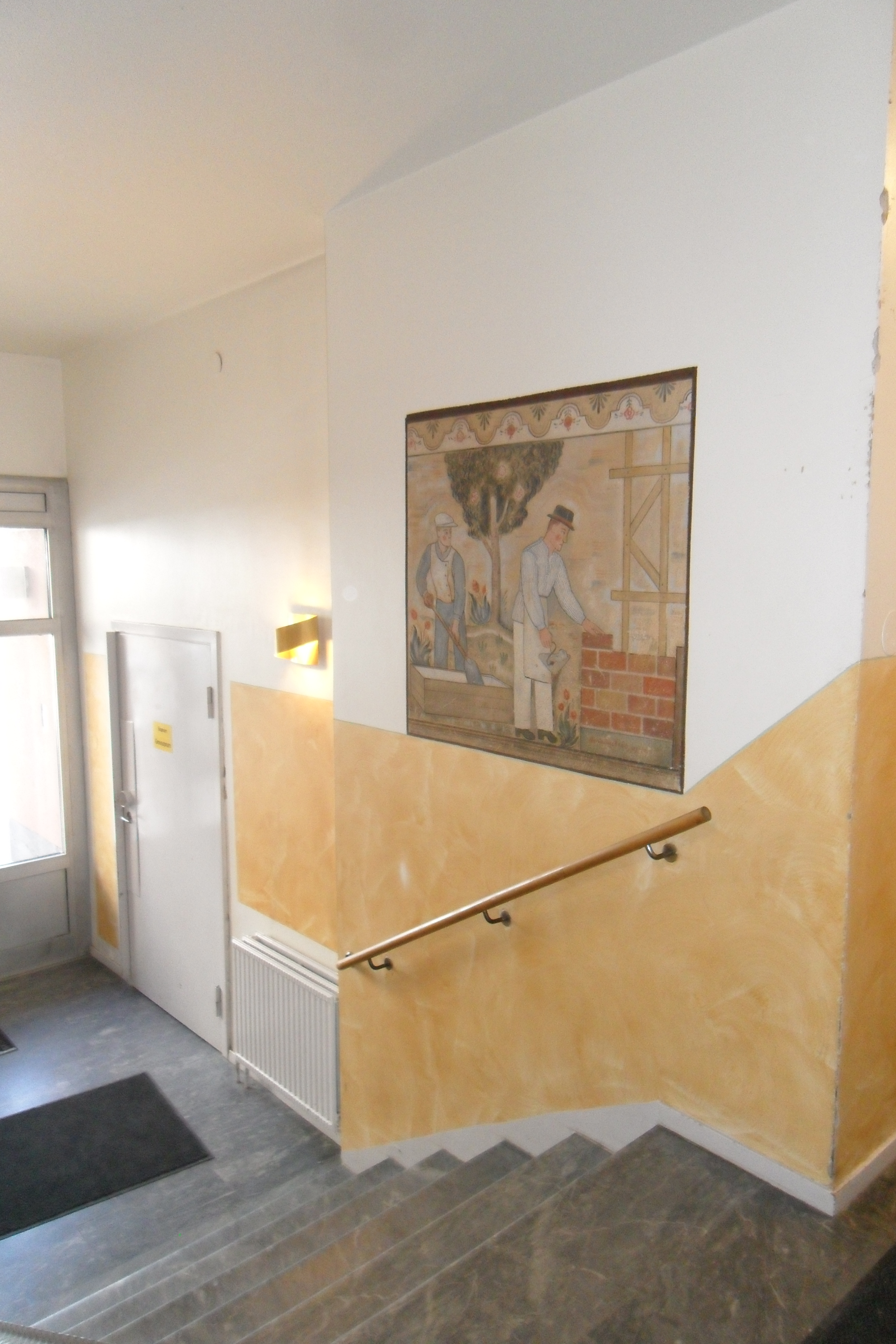 Konservering & trapphusrenoveringTrapphusrenovering: Befintliga entréportar renoverades och kalkstensbeläggning på golv och trappor reparerades utan slipning. Väggar och tak måladess om med ny färgsättning, samt konserveringsåtgärder på väggmålerier.
